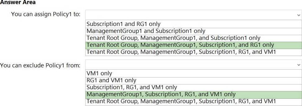 To which Azure resources can you assign Policy and which Azure resources can you specify as exclusions from Policy1? To answer, select the appropriate options in the answer NOTE Each correct selection is worth one point.