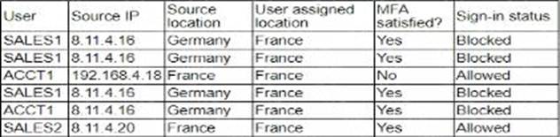 The table shows that the user "SALES1" is consistently blocked despite having met the MFA requirements. The common factor in these blocked attempts is the source IP address (8.11.4.16) being identified as from Germany while the user is assigned to France. This discrepancy suggests that the network geolocation is being misidentified by the authentication server, causing legitimate access attempts to be blocked.