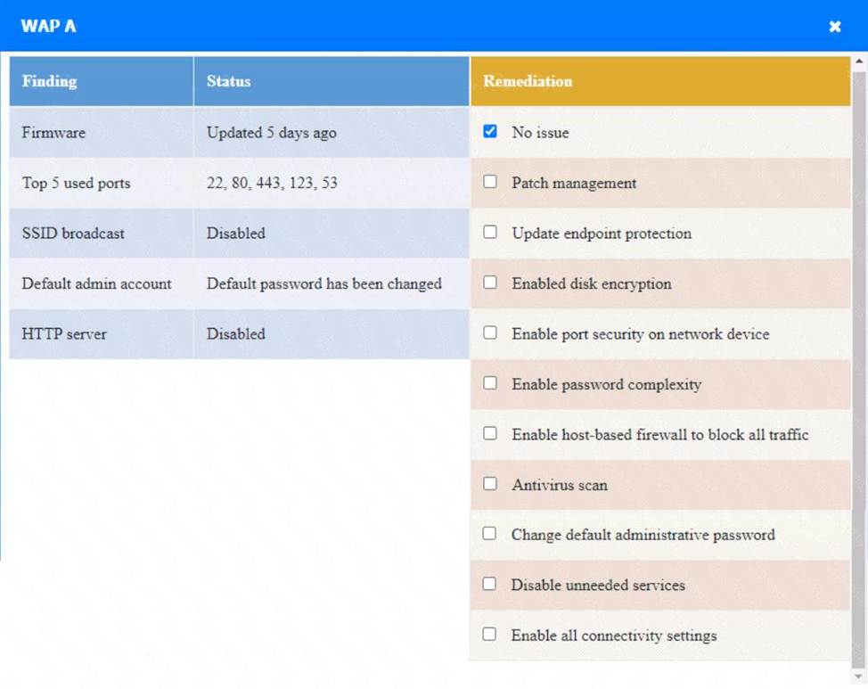 정답: WAP A: No issue found. The WAP A is configured correctly and meets the requirements.