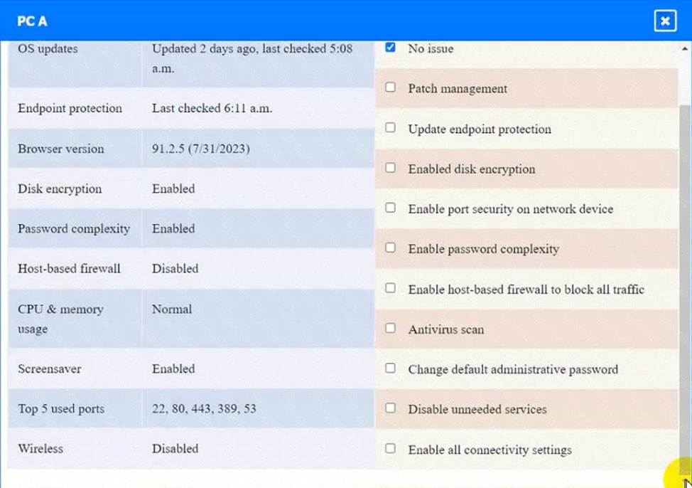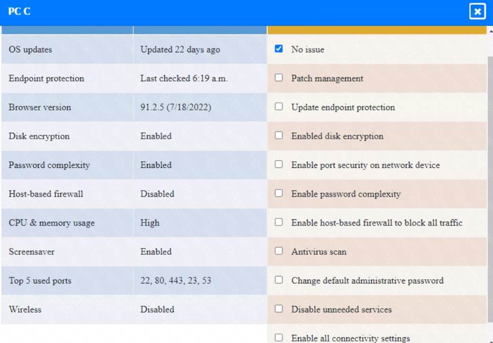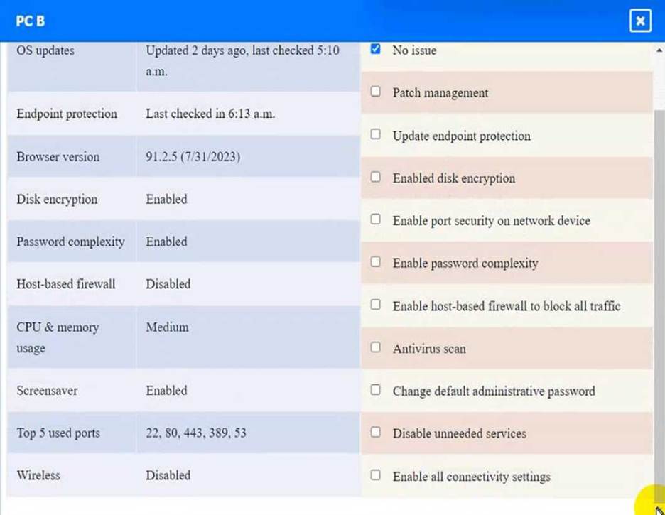 This option will turn off the host-based firewall and allow all traffic to pass through. This will comply with the requirement and also improve the connectivity of PC A to other devices on the network. However, this option will also reduce the security of PC A and make it more vulnerable to attacks. Therefore, it is recommended to use other security measures, such as antivirus, encryption, and password complexity, to protect PC A from potential threats.