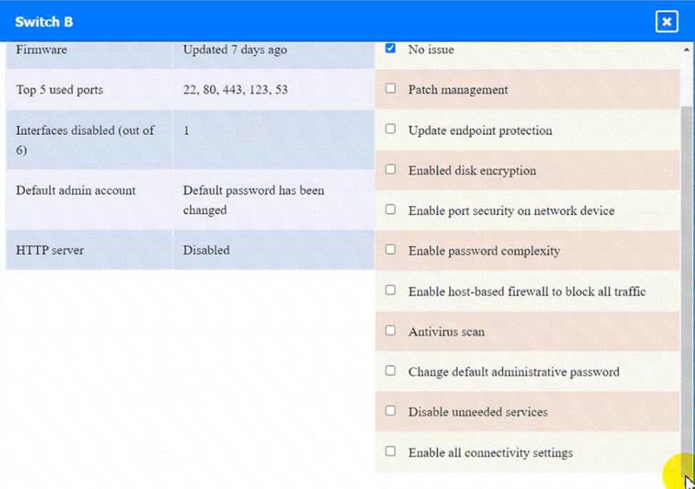 Switch B: No issue found. The Switch B is configured correctly and meets the requirements.