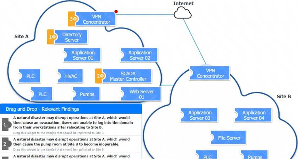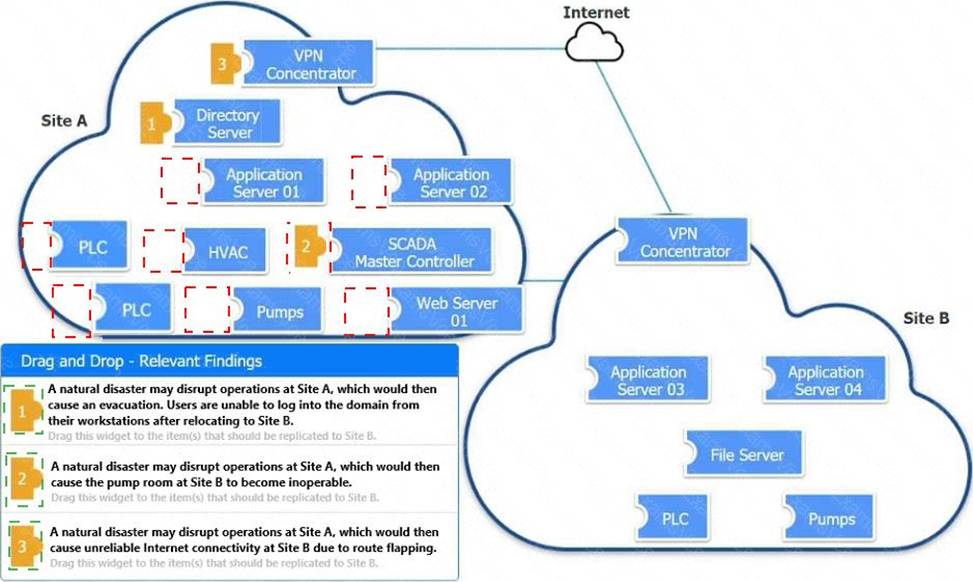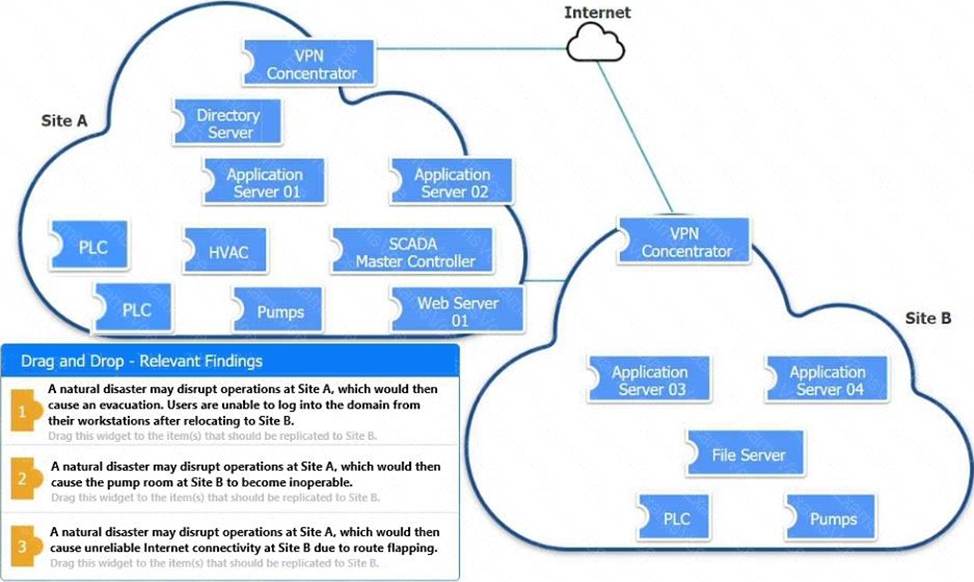 Reason: Users are unable to log into the domain from their workstations after relocating to Site B, which implies a failure in domain name services that are critical for user authentication and domain login.