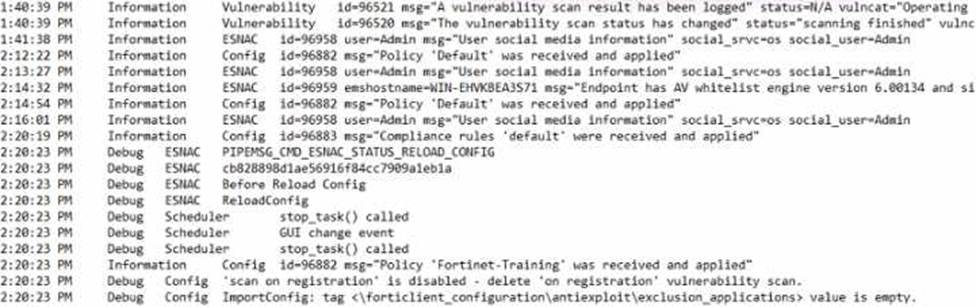 Reference: FortiClient EMS policy configuration and log analysis documentation from the study guides.
