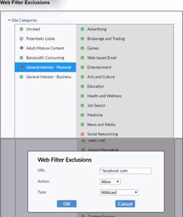 The exhibit shows a web filter exclusion for "*.facebook.com" with the action set to "Allow."