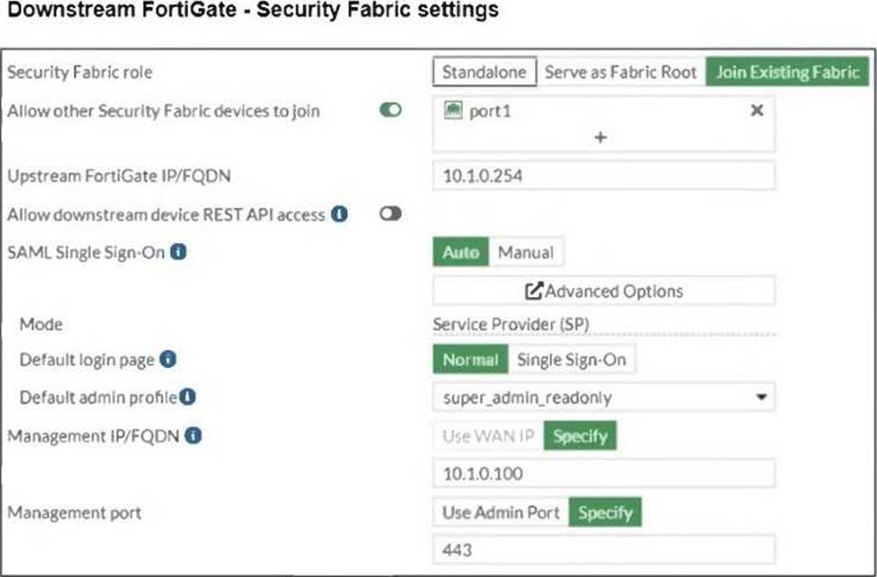 When the AdminSSO user logs into the downstream FortiGate using SSO, the authentication request is sent to the root FortiGate, where AdminSSO has super_admin_readonly permissions. Since the downstream FortiGate inherits this permission through the Security Fabric configuration, the user will be granted super_admin_readonly access.