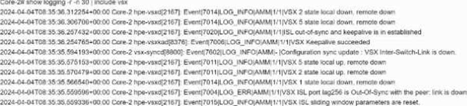 If the ISL between two VSX core switches is down and logs indicate that Core-2 has disabled its VSX LAG interfaces, it means Core-2 has disabled its VSX LAG interfaces, likely as a protective or failover mechanism.