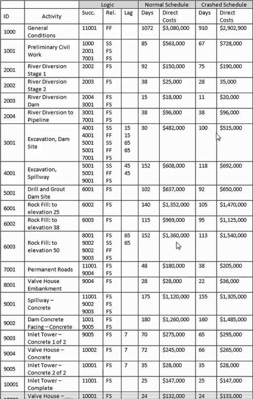 Identifying Predecessor and Successor: Predecessor: Activity 5001 (Drill and Grout Dam Site). Successor: Activity 8001 (Rock Fill to elevation 50).