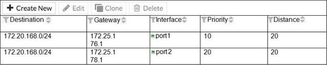 FortiGate will use the port1 route as the primary candidate. It has better priority.