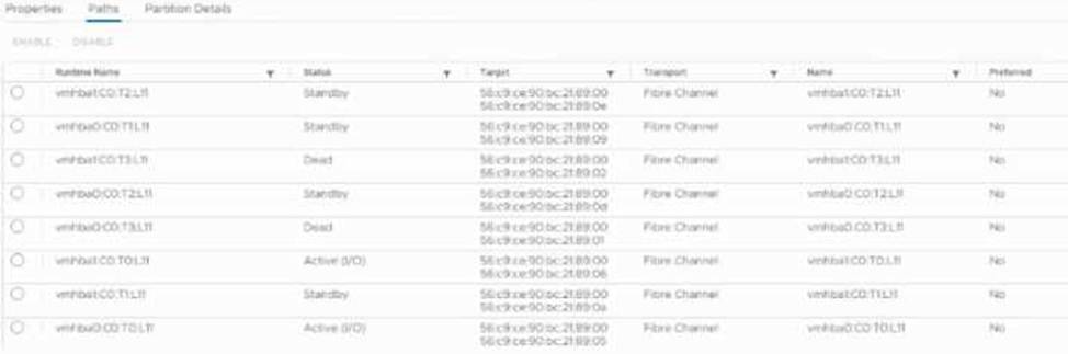 In the exhibit, several paths show “Standby” and some appear “Dead”, while only a subset is Active (0). This typically indicates that one storage controller may be missing or offline, which reduces redundancy and can cause performance degradation. In a healthy Peer Persistence environment, both controllers should present active and non-optimized paths.