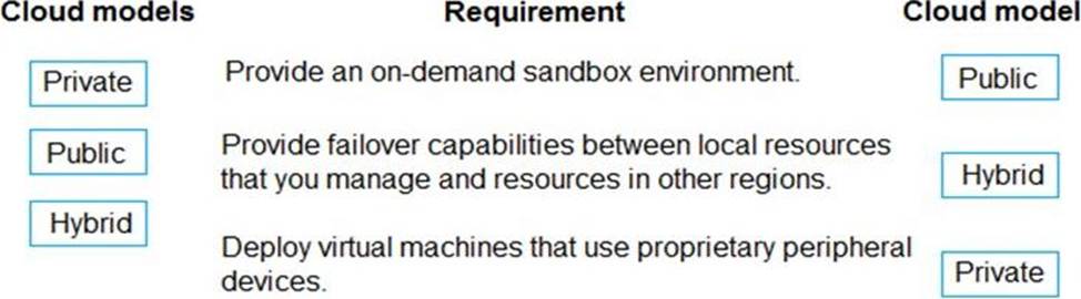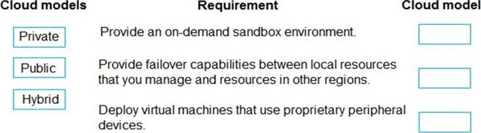 Which cloud models should you use? To answer, drag the appropriate cloud models to the correct requirements. Each cloud model may be used one, more than once, or not at all.