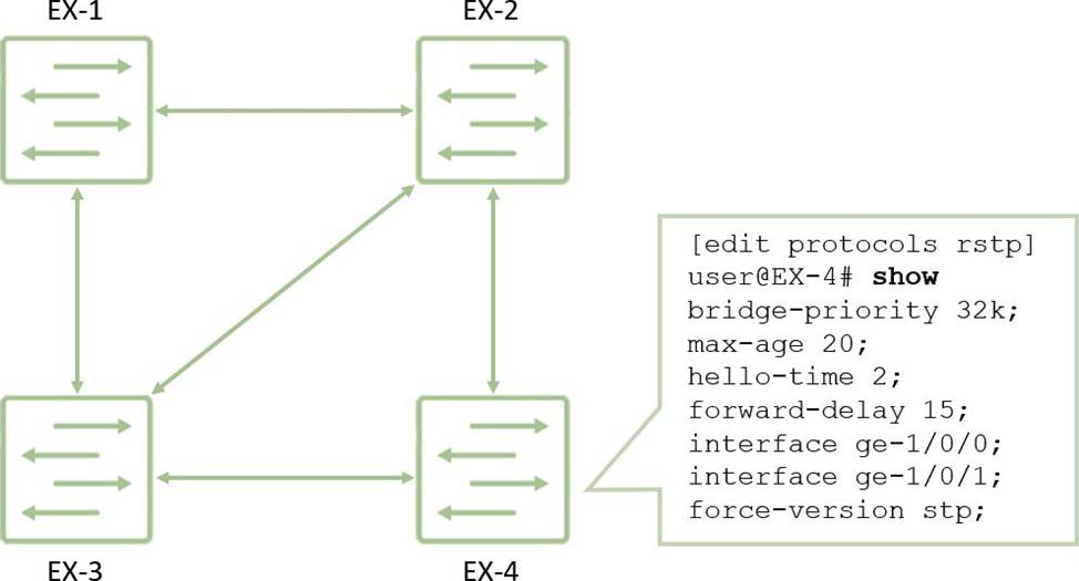 You have configured the four EX Series switches with RSTP, as shown in the exhibit. You discover that whenever a link between switches goes up or down, the switches take longer than expected for RSTP to converge, using the default settings.