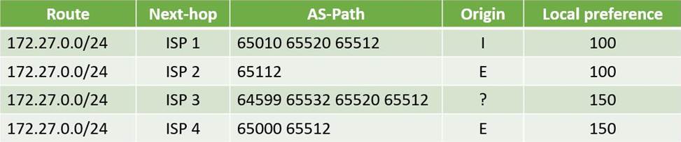 You are receiving the BGP route shown in the exhibit from four different upstream ISPs.