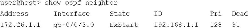 Referring to the exhibit, why is this OSPF adjacency remaining in this state?