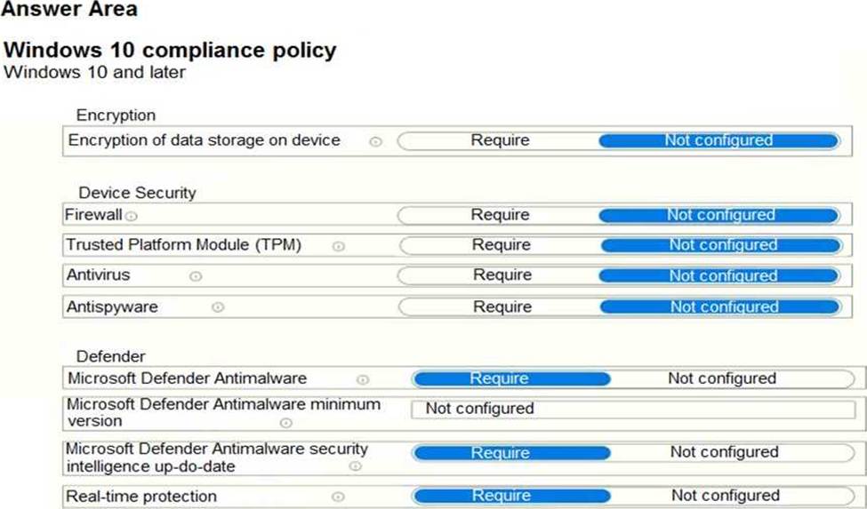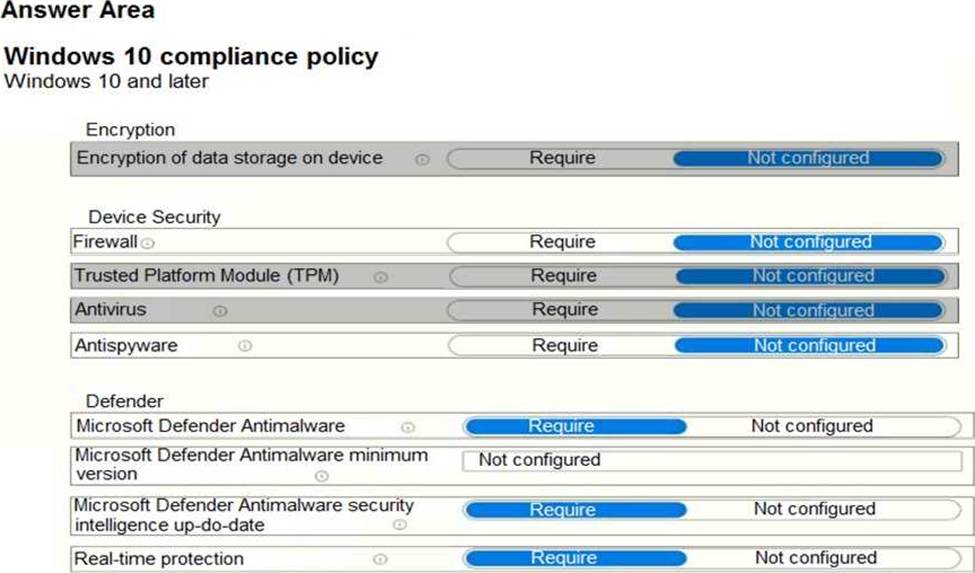 Which three settings should you modify in the compliance policy? To answer, select the appropriate settings in the answer area. NOTE: Each correct selection is worth one point.
