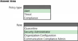 Which type of policy should you create and which Microsoft 365 compliance center role is required to create the pokey? To answer, select the appropriate options in the answer area. NOTE: Each correct selection is worth one point.